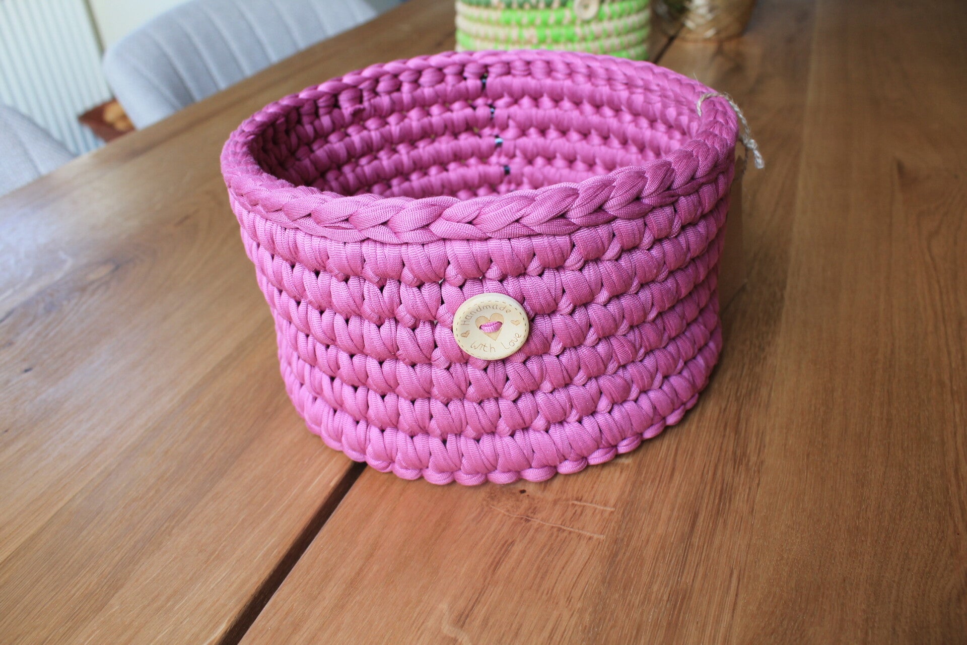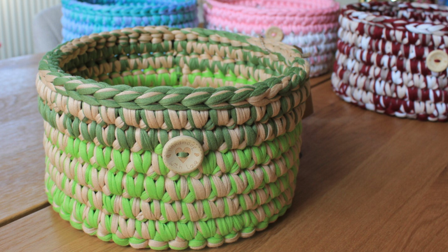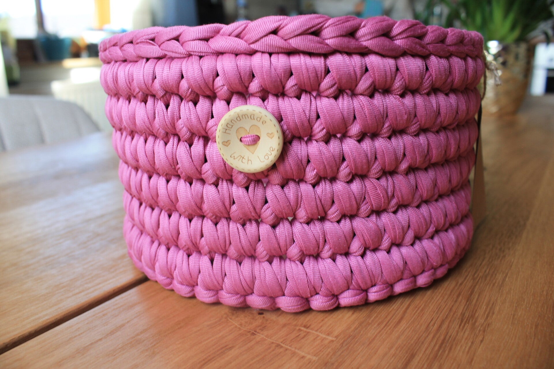 Gehäkelter Korb mit Holzboden – stilvoll organiserend