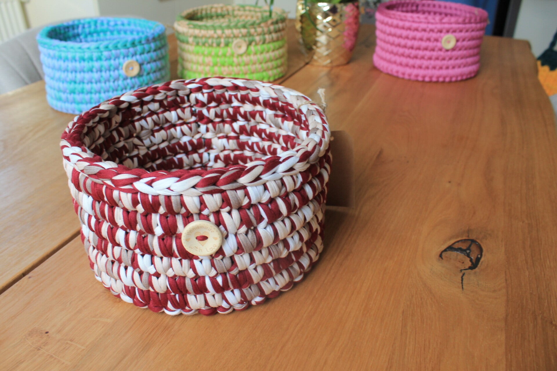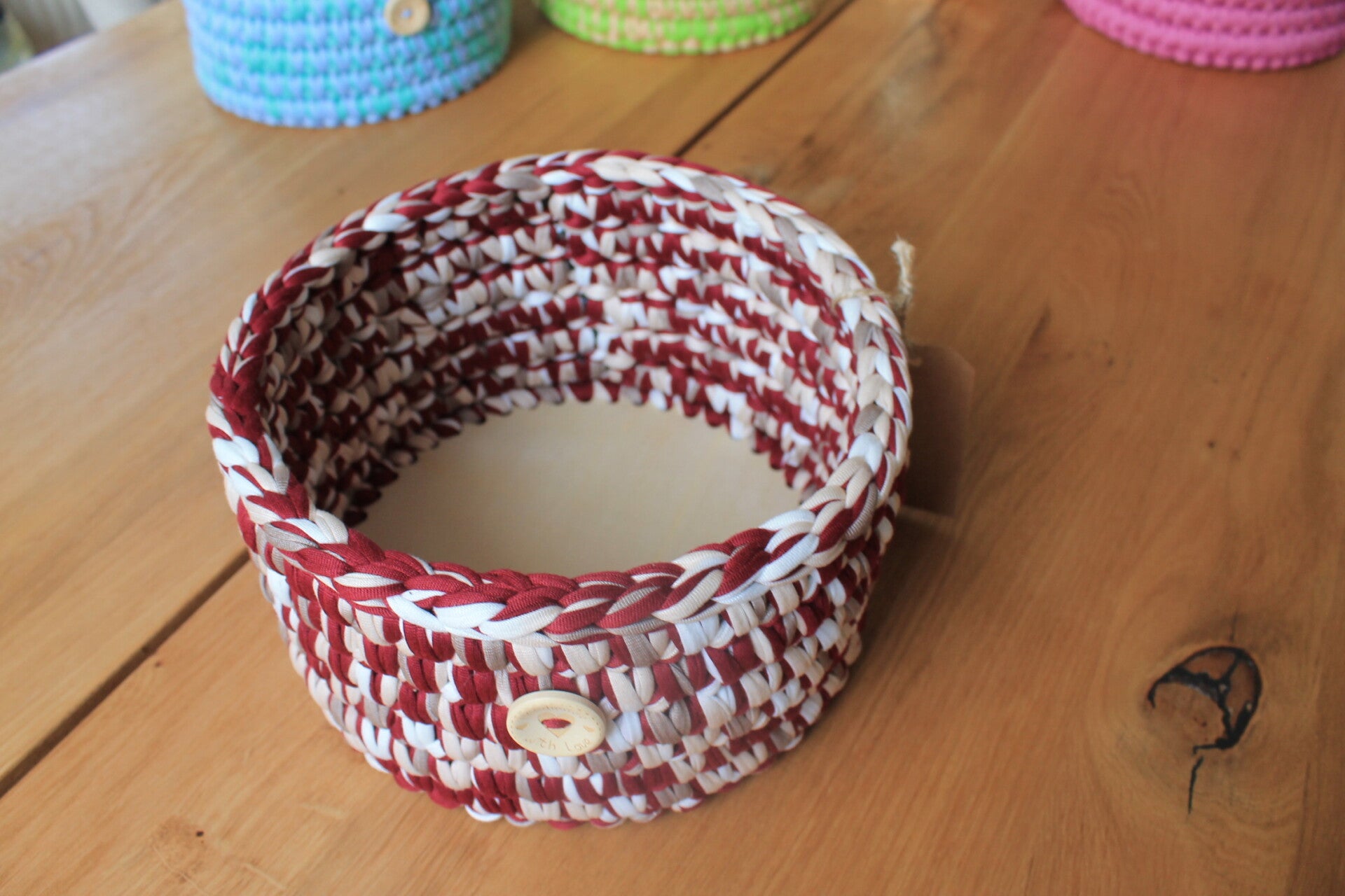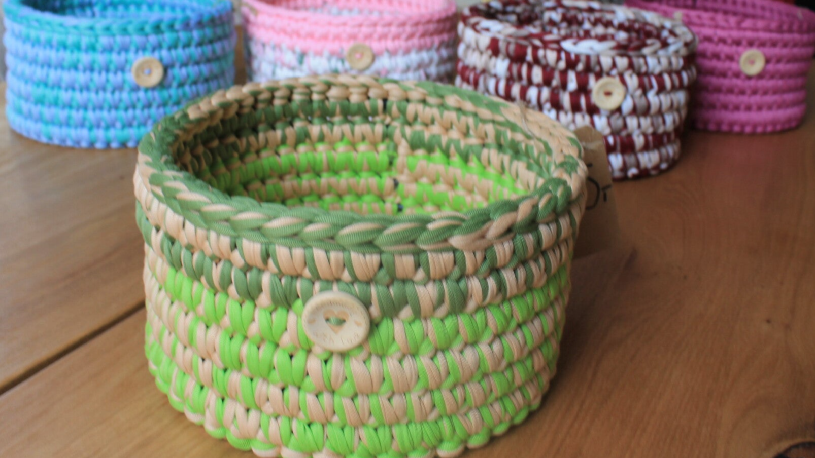 Gehäkelter Korb mit Holzboden – stilvoll organiserend